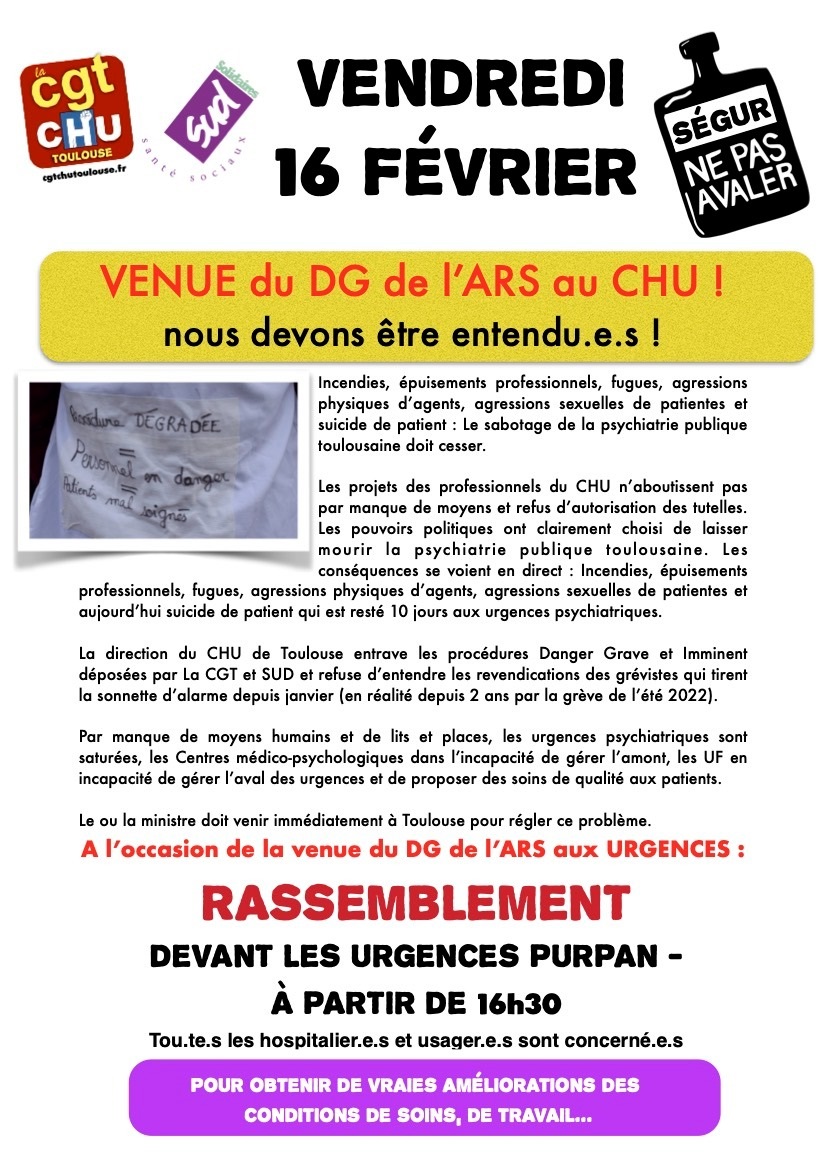 agressions sexuelles aux urgences de purpan : nous exigeons des réponses. Des événements d’une grande gravité sont encore intervenus dans la nuit du 10 février 2024 aux urgences psychiatriques de Purpan du CHU de Toulouse : 2 patientes ont été victimes d’agressions sexuelles. Le syndicat SUD Santé Sociaux du CHU de Toulouse, membre …